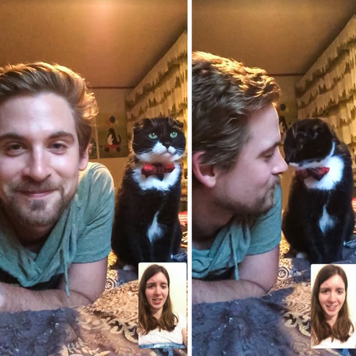 19. “Please don’t mind my inability to make a normal face while admiring my long-distance boyfriend and our precious cat!”