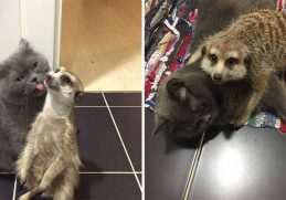 Cat And Meerkat Are Best Friends And Love To Cuddle With Each Other