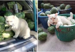Meet Pearl, The Grouchy-Looking Cat That Supervises Watermelon Farm In Thailand