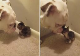 Gentle Bulldog Meets Cute Tiny Kitten For The First Time