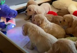 in Dogs 10 Cute Golden Retriever Pups Get Hooked Into The Fairy Tale That The Purple Dragon Reads For Them