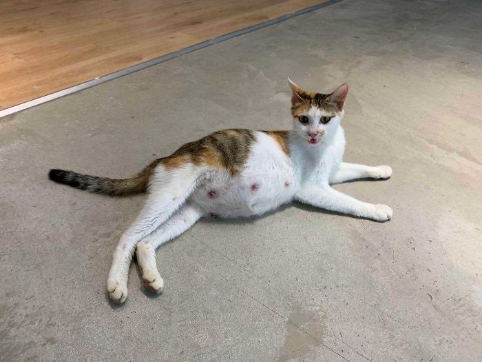 According to her post, her colleague Yvonne was on the way to work when she met a heavily pregnant stray cat. The stray was thin and looked very young.