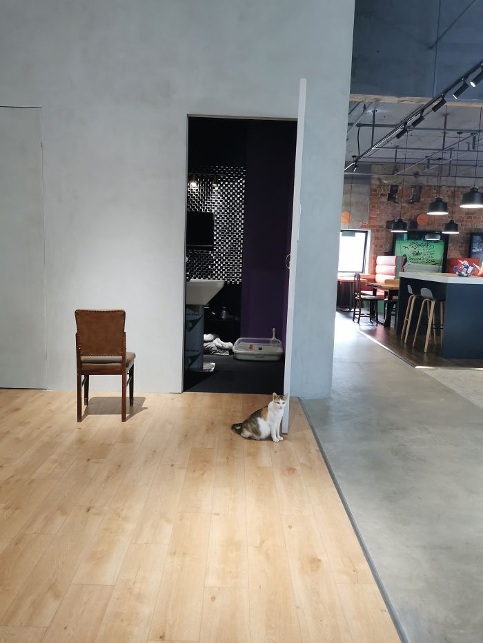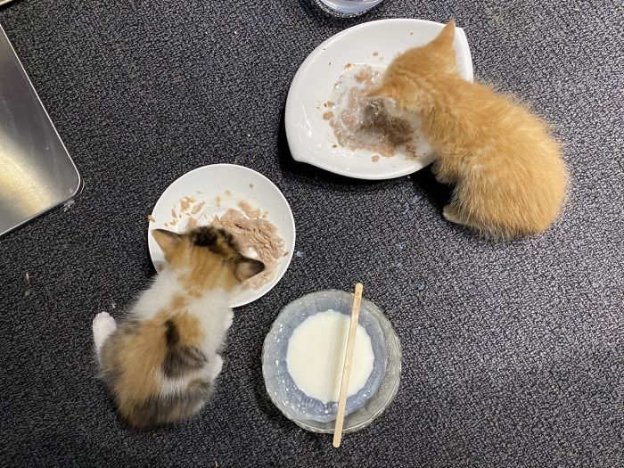 “We placed her in a spare meeting room, where we prepared her a litter box, cushy bedding, and all the food (dry, canned tuna, fresh fish, milk) she could want.”