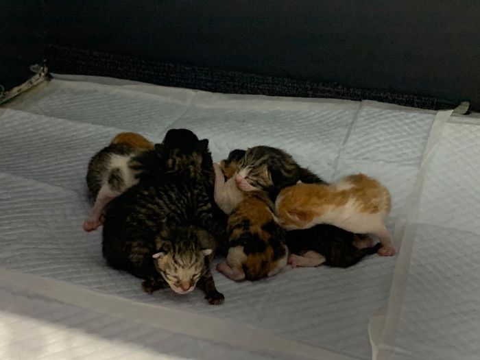 “Boba still being such a good mom. We are going to spay Boba and find great adopters for all the little ones. We hope someone adopts Boba together with one of her babies. For now, they are still enjoying their new little family, and everyone in the office is so lucky!”