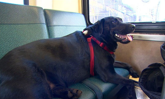 When it’s her stop, the black Labrador jumps down the stairs excited for playtime at the park.