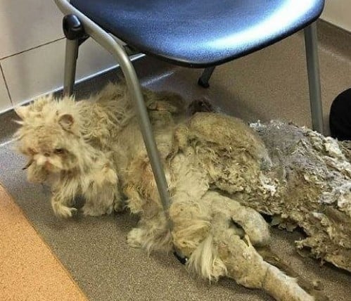 When investigators went to the man’s house to check on the cat, they were shocked by what they found. The cat had been so neglected that he was trapped in his own fur, and he could barely walk. The fur was so matted and heavy (around five pounds), that it was filled with dirt and feces.