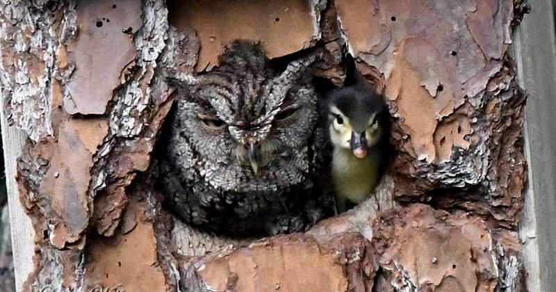 Owl and Duckling Stay Together In A Nesting Box, Captured By A Wildlife Artist