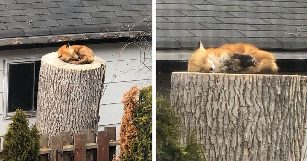 Adorable Small Fox Caught Sleeping Peacefully On A Tree Stump